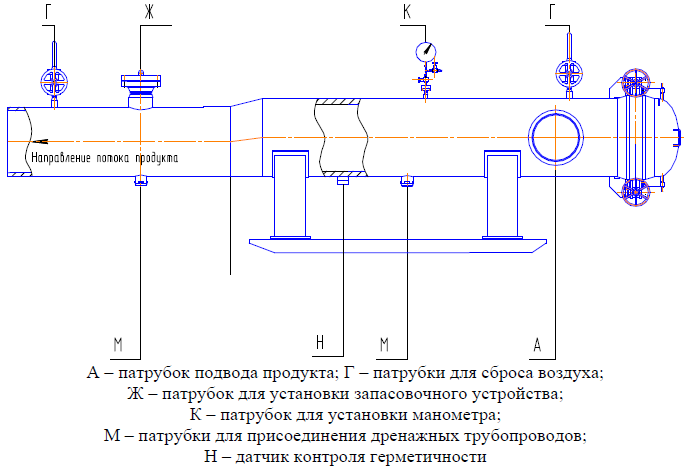 А – патрубок подвода продукта, В – патрубок для датчика давления, Г – патрубки для присоединения трубопроводов газовоздушной линии, Д – патрубок для подачи пара или инертного газа, Е – патрубок для установки сигнализатора рычажного, Ж – патрубок для установки запасовочного устройства, К – патрубок для установки манометра, М – патрубки для присоединения дренажных трубопроводов, Н – датчик контроля герметичности. Камера запуска СОД размеры