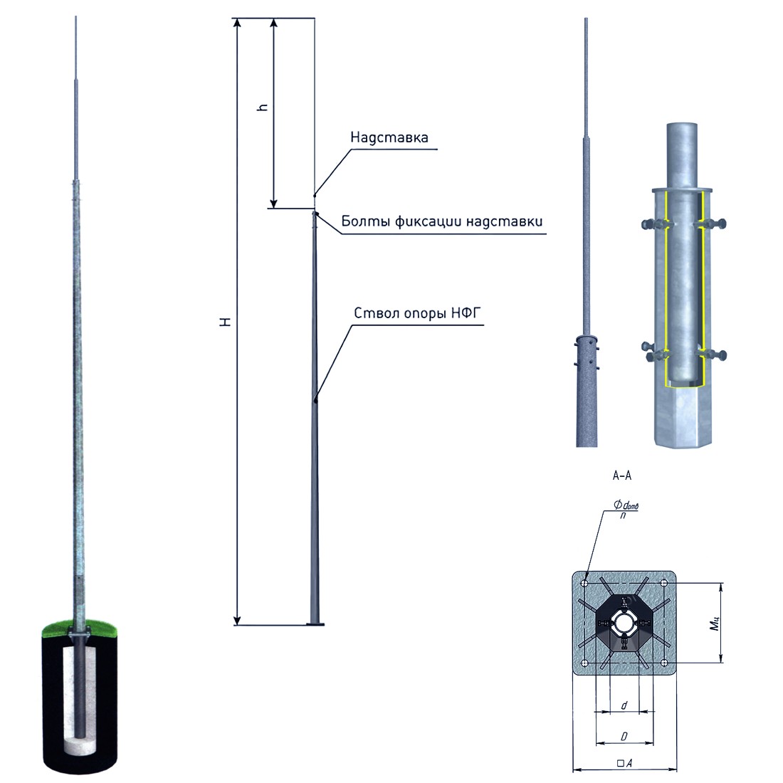 - Если молниеотвод будет повреждён вследствие механических воздействий или по другим причинам, фланцевое соединение позволяет демонтировать его и установить новую опору без разрушения фундамента.