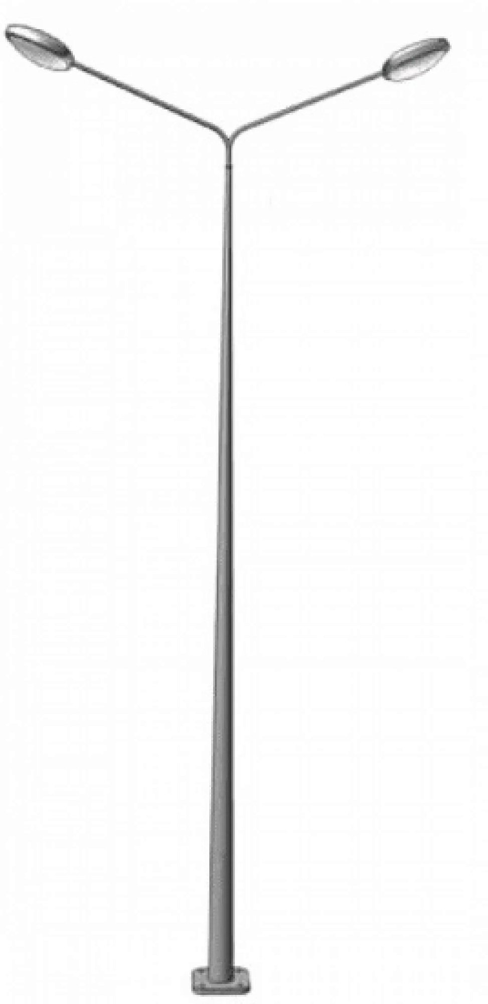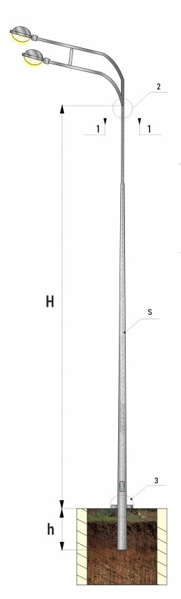 - Диаметр ствола опоры уменьшается по направлению от основания к оголовку. Поэтому конструкция имеет вид конуса, на вершине которого устроено посадочное отверстие под кронштейн светильника уличного освещения.