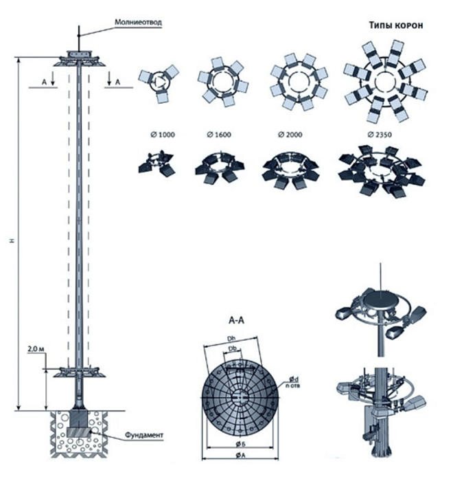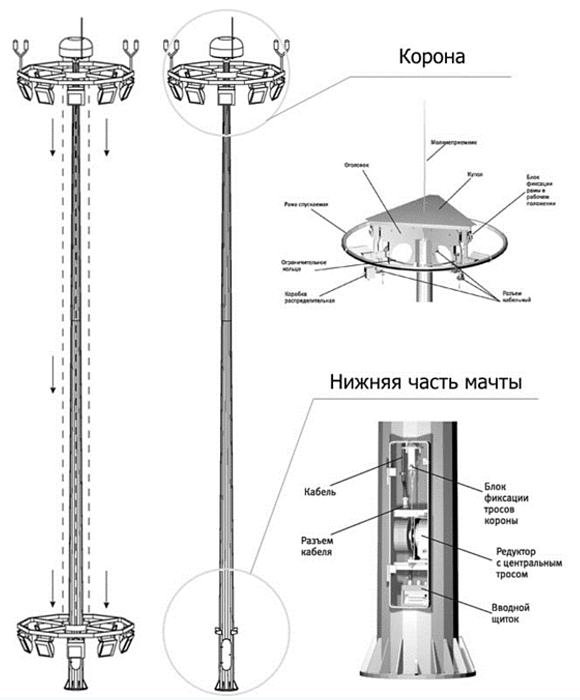 Высокомачтовая опора – это стальное вертикальное сборное сооружение в виде стойки, высота конструкции варьируется от 16 до 70 метров.